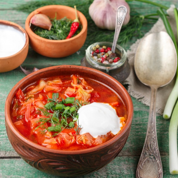 БОРЩ С ГОВЯДИНОЙ Символ домашней кухни! Его глубокий рубиновый цвет, насыщенный вкус свеклы и капусты, ложечка сметаны и свежий укроп превратят любой ужин в кулинарный праздник. ▸ Объём - 300 мл. ▸ Бесплатно к заказу добавим - сметану, чеснок, свежий хлеб ▸ Состав - говядина, свекла, сок лимона, капуста, морковь, картофель, лук репчатый, томатная паста, сливочное масло, соль, лавровый лист, зелень ▸ Энергетическая ценность кДж (ккал) на 100 г: 374/89 ▸ Пищевая ценность на 100 г: жиры — 4,3 г; белки — 7,4 г; углеводы — 5,9 г ▸ Срок годности 2 суток с даты изготовления